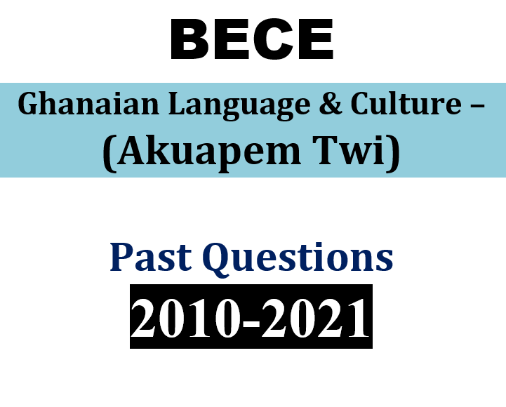 Ghanaian Language and Culture (Akuapem Twi) BECE Past Questions (PDF). Paper 1 (Objectives) and Paper 2 (essay/written). 2019 & 2020 (Questions and Answers). 2010-2018, 2021 (Questions only).