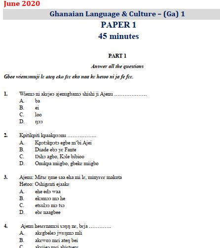 Ghanaian Language & Culture (Ga) 2020 BECE Past Questions – PDF. Both Papers 1 (Objectives) and Paper 2 (Essay / Written)