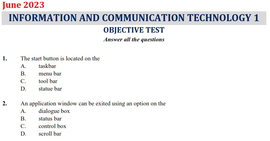 Information and Communication Technology 2023 BECE Past Questions and Answers (PDF). Paper 1 (Objectives) and Paper 2 (Essay / Written). The answers are based on the marking scheme.