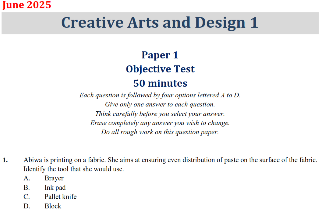June 2025 Creative Arts and Design 1 Paper 1 Objective Test 50 minutes Each question is followed by four options lettered A to D. Give only one answer to each question. Think carefully before you select your answer. Erase completely…
